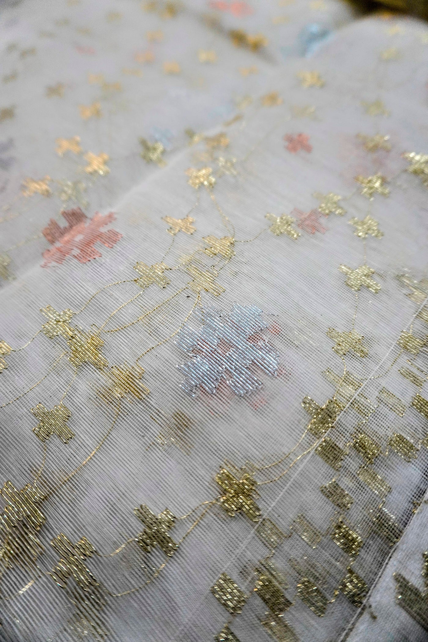 Metallic Mosaic - 84 Count Half-Silk Ivory Jamdani with Gold-Silver-Copper Motifs