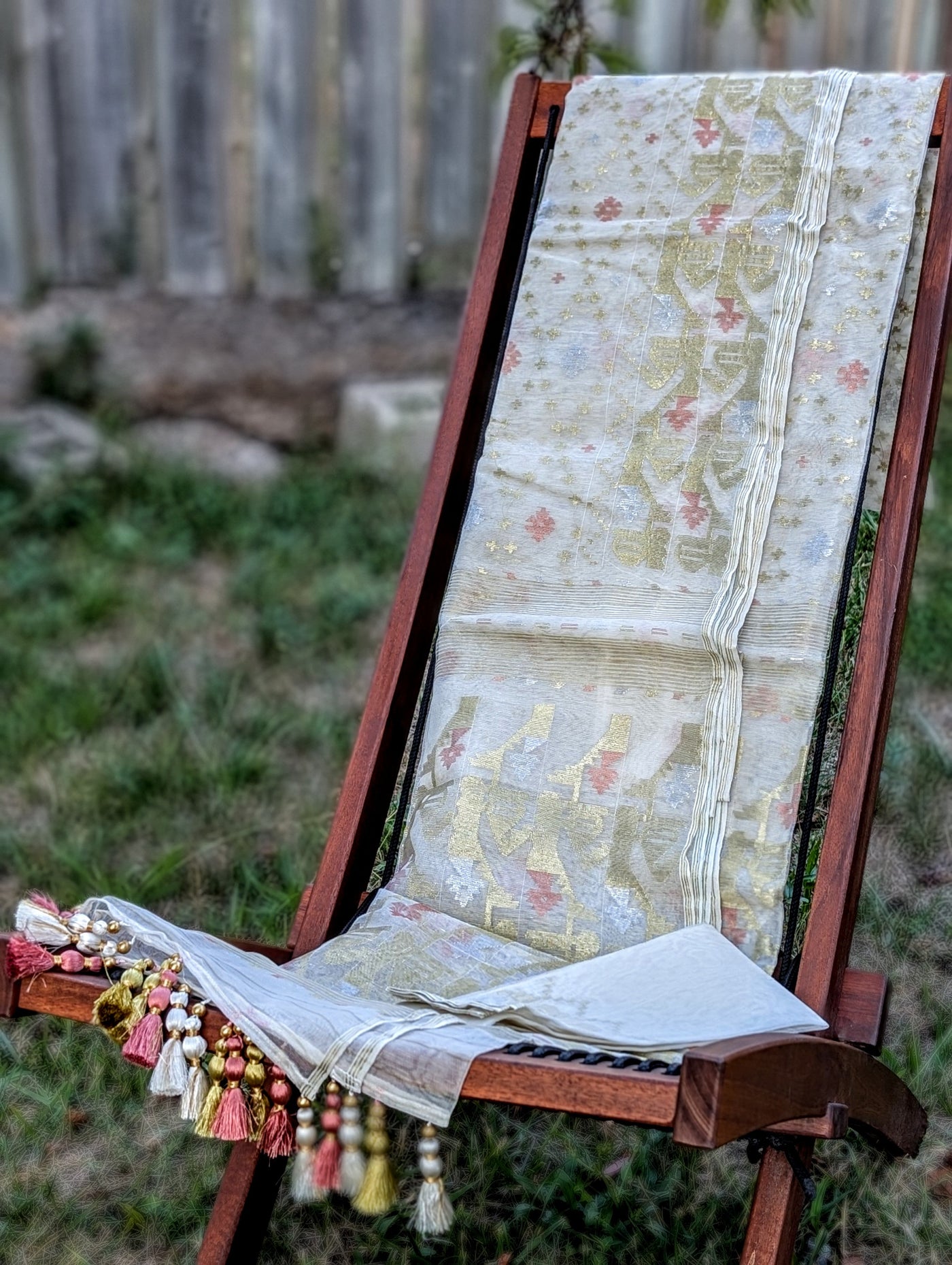 Falls, pico, and tassels are done. An unstitched blouse fabric is included.