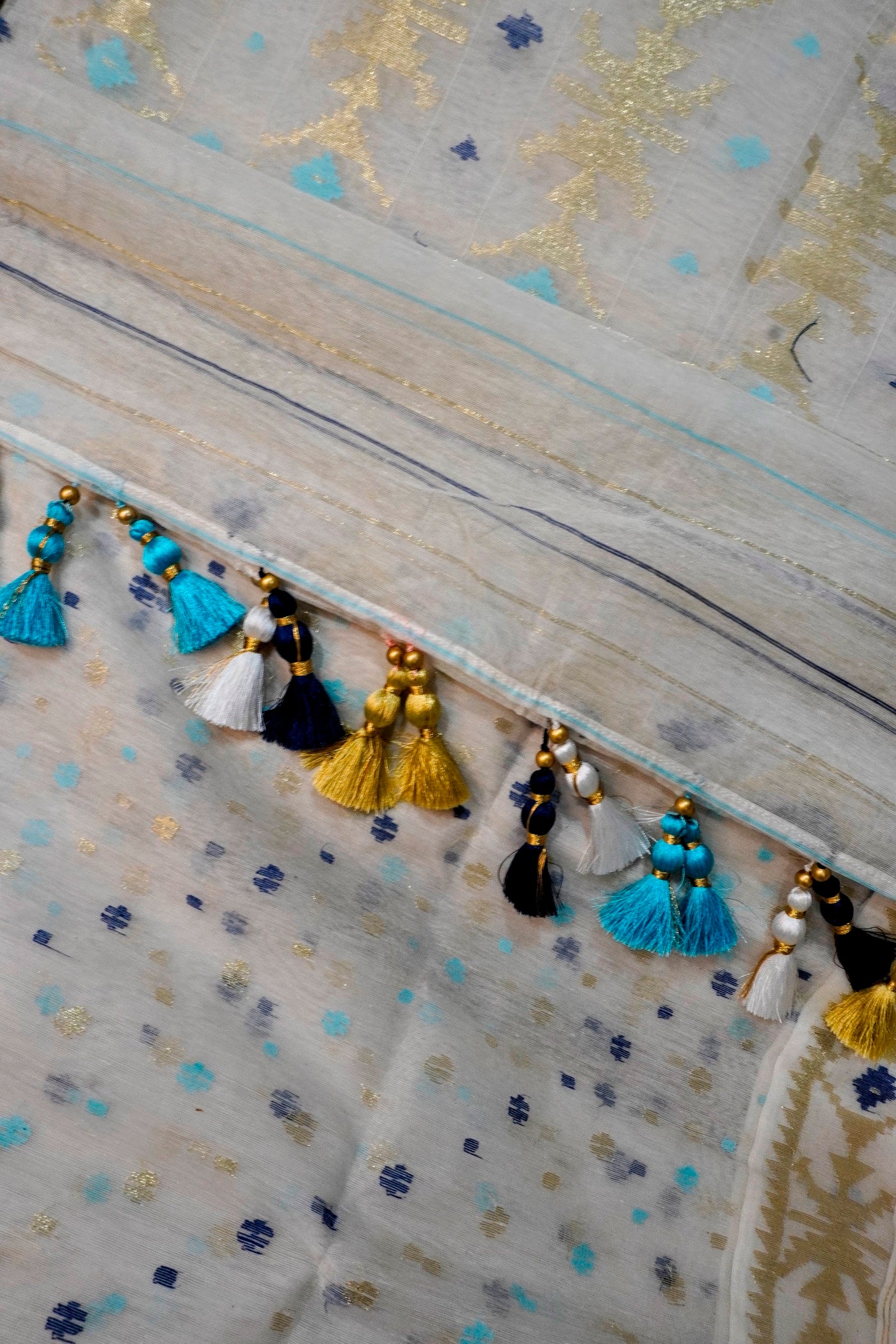 Blue & Gold Reverie - 84 Count Half-Silk Ivory Jamdani with Blue and Gold Motifs