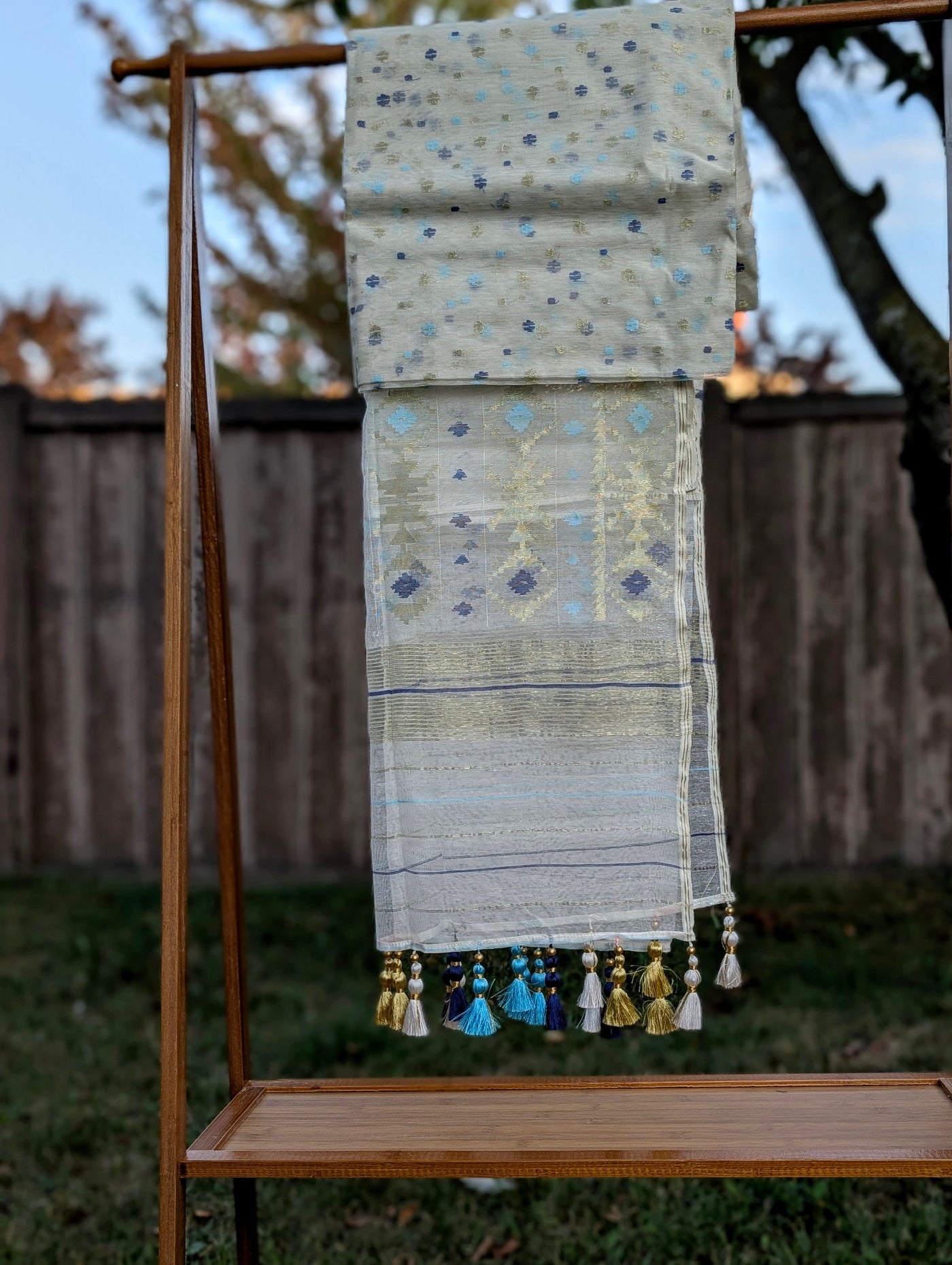 Falls, pico, and tassels are done. An unstitched blouse fabric is included.
